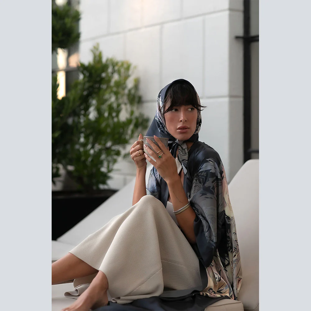 Inspired by our in-store mural and created by artist Valerie Santillo, Jia botanical print scarf features our Chinatown shop’s mural design, a cornerstone of our store. This incredibly versatile floral scarf is the perfect piece of art to take with you on the go. Wear it as scarf, head wrap, on your tote, or even as a face mask — the possibilities are endless. The charmeuse scarf is beautiful and soft, easy to care for, and infuses any outfit with a little luxury for your every day.