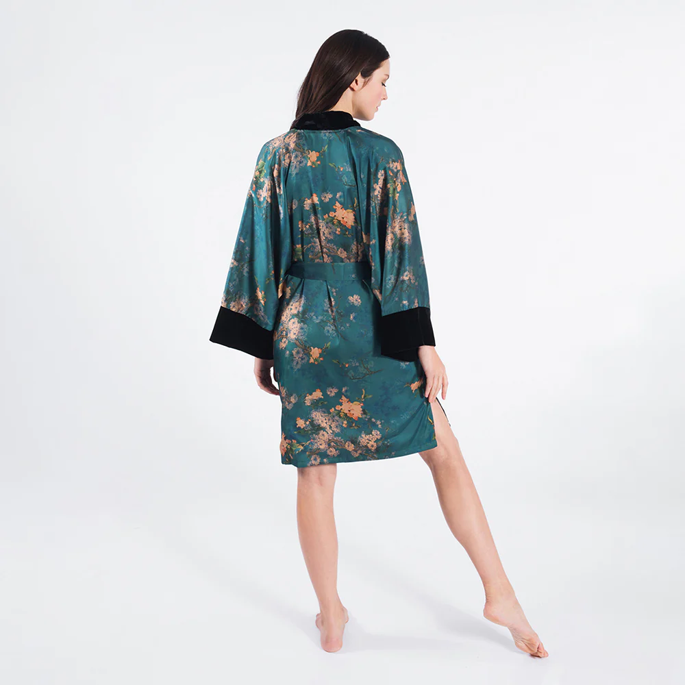 The statement piece that will turn heads. With beautiful velvet trim and a modern design, this teal floral kimono wrap is slightly heavier in weight and easy to clean and care for, making this flattering robe your elegant kimono cover up for delightful nights in or a festive short kimono cardigan for decadent nights out. Be sure to also check out the long Haruka kimono wrap.