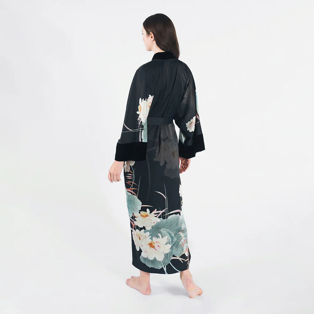 The statement piece that will turn heads. With beautiful velvet trim and a modern design, this kimono wrap dressing gown is slightly heavier in weight and easy to clean and care for, making this flattering robe your elegant kimono cover up for delightful nights in or a festive long kimono jacket for decadent nights out. Also check out the Maren long kimono robe in black or blue.