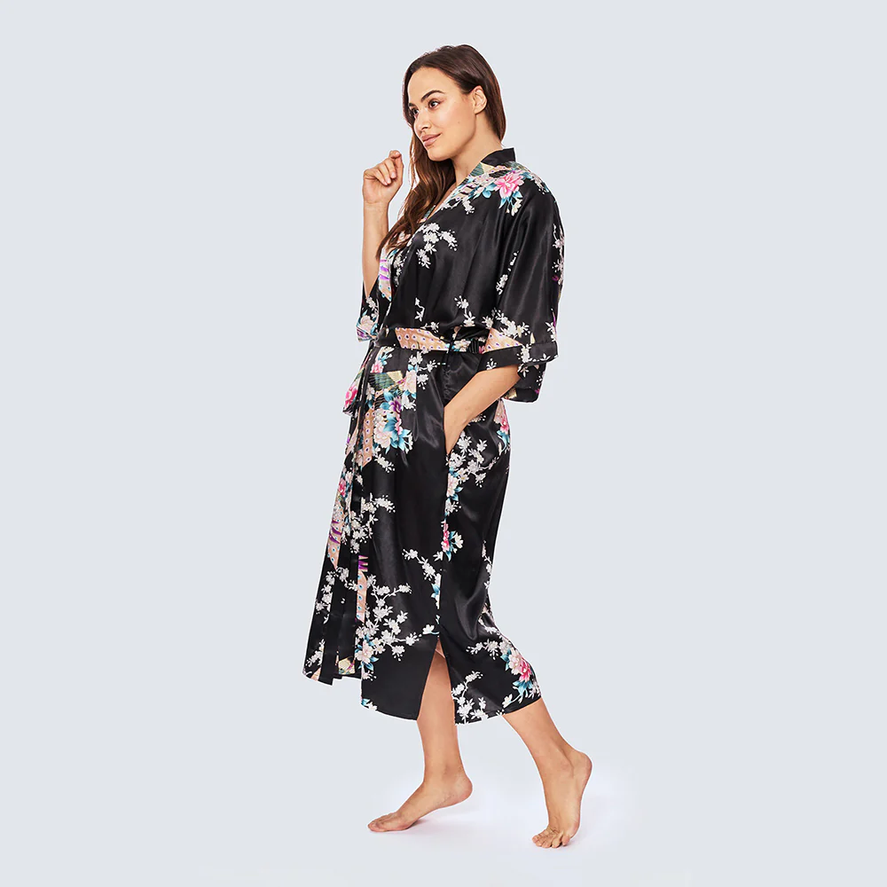 Give yourself a luxurious night in or a colorful night out with this satin blossoms and peacock kimono robe — which functions as a lounge robe, bathrobe, or long kimono cardigan in warmer weather. With the beautifully detailed print of flower blossoms and peacocks, a symbol for integrity, this easy-care fabric kimono is your go-to staple for every special occasion.